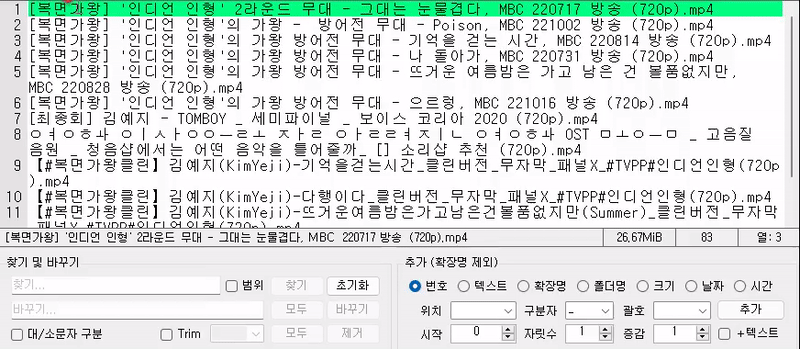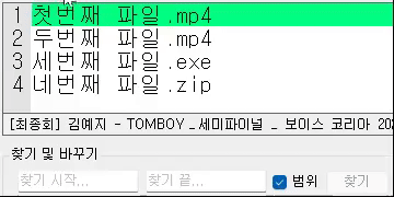 폴더 내 파일 중 특정 단어(ex: '다시보기')가 포함된 비디오(ex: '.mp4') 파일을 목록(텍스트 Editor)에 추가하는 샘플 코드입니다.